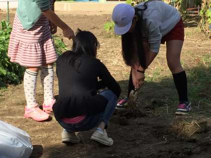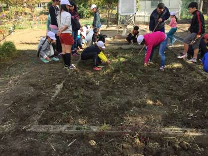 5年生は収穫をを終えた水田のあとを片づけていました。土を掘り起こすと、自分たちが植えた苗がしっかり根をはった様子がわかります。これも、大切な学習です。