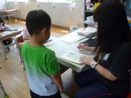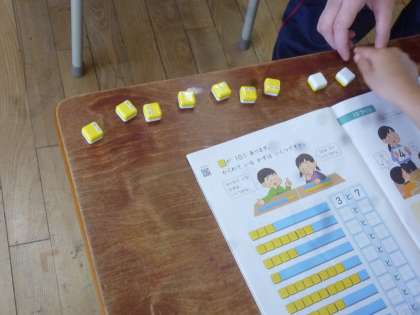 1年生は算数で「10は7と3」というように数の合成の学習を続けています。今日は「10は1と9」など、考えられる答えを考えました。時にはブロックも使いながら答えを導いていました。できたら担任に見せに行きました。