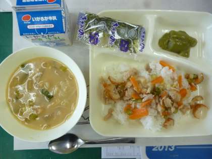 5月21日の給食は「かやくご飯」「きざみのり」「みそ汁」「抹茶ういろう」です。かやくご飯は具がご飯によく合っており、おいしくいただけました。