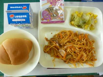5月23日の給食は「ミートソーススパゲティ」「レタスとコーンのサラダ」「芋けんぴフィッシュ」です。スパゲティはどのような種類でも大人気献立です。もちろん、今日もおいしくいただけました。