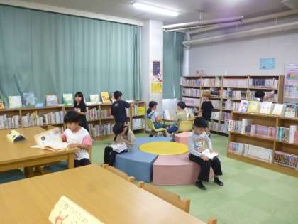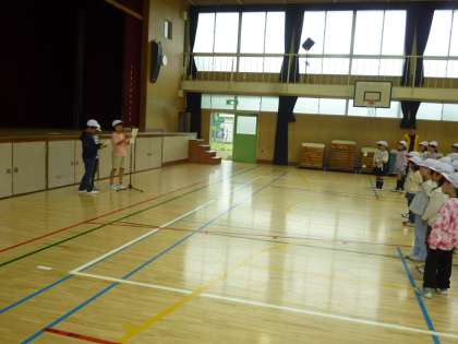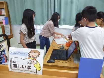 本校では読書に親しむため、月曜日の児童朝会後の朝の会で各クラス、読書をしています。また、毎日20分休みに図書館開放をして自由に本を読んでもよい時間を設けています。本の貸し出しもしています。月曜日から木曜日は児童図書委員会の児童が、金曜日は学校図書館補助員の先生が貸し出しを担当しています。児童朝会で児童図書委員会が図書館開放をアピールしてくれました。