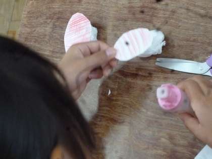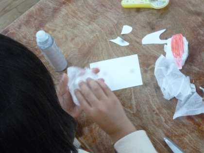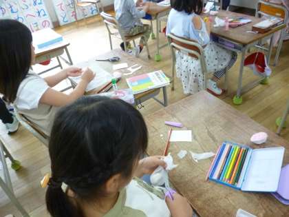 1年生は「光まつり」で使う握り寿司を作りました。しゃりはティッシュペーパーを丸めて作り、ネタのマグロは画用紙を切って色を塗りました。今後、マグロ以外のネタと軍艦寿司を作ります。