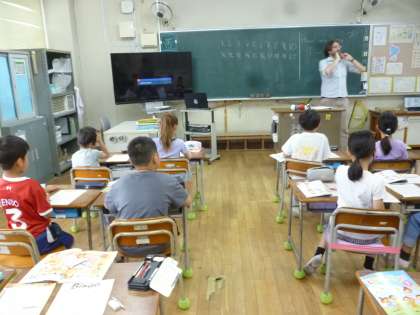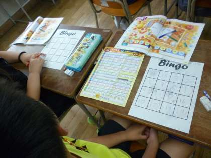 3年生は英語でビンゴを楽しみました。マス目に自由に数字を書き、先生が英語で数字を言います。書いた数字が呼ばれると〇をつけていきます。ビンゴになると歓声が上がりました。