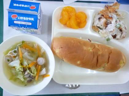 5月27日の給食は「マカロニグラタン」「キャベツのスープ」でデザートに缶詰のみかんがでました。今日のグラタンは鶏肉と玉ねぎを炒めたものに、クリーム、小麦粉、牛乳、グリーンピース、マカロニを加え、チーズとパン粉をふって焼いているそうです。