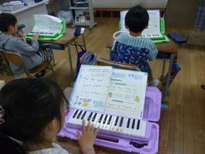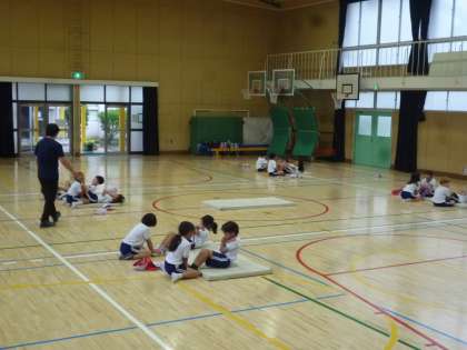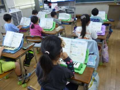 2年生は鍵盤ハーモニカの練習をしています。一つ一つの音を正確に弾こうとがんばっていました。体育館では体力テストをしました。