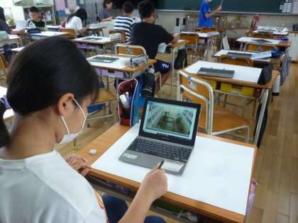6年生は校内の好きな場所を絵に描く学習を始めました。校内をまわり、写真を撮ってそれを見て描いていきました。