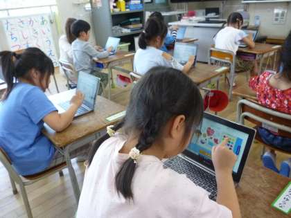 1年生は初めてタブレット端末を使いました。電源やパスワードの入れ方から始め、段階を追って使っていきました。