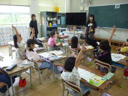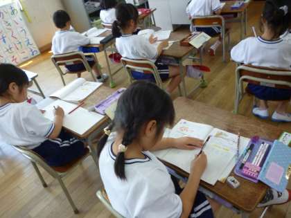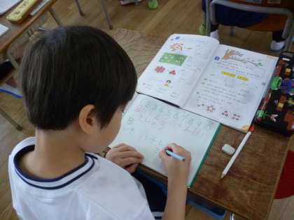 1年生は算数で文章題を習いました。問題をよく読むこと、式を考えること、答えをきちんと書くことなど、ノートの書き方を教えてもらい、答えを出していました。1年生はわかったことは積極的に手を挙げてがんばっています。