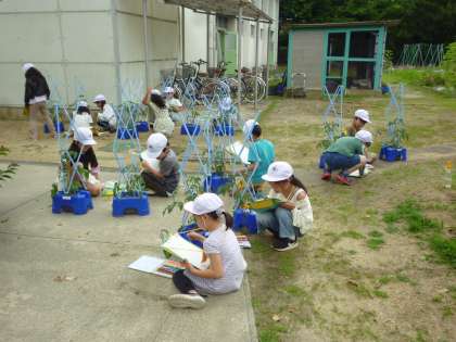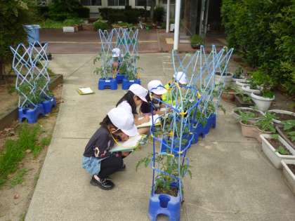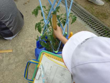 2年生はミニトマトの観察を続けています。今日はものさしを使って茎の高さを測りました。