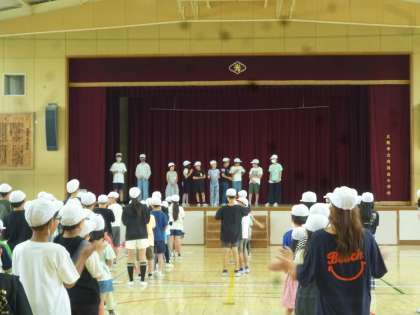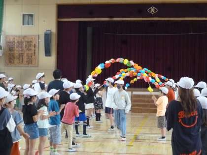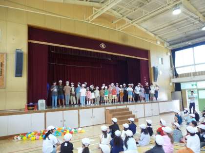 先週と今週、「バースデー集会」をしました。誕生月の児童と職員を祝う集会です。今年から始めた集会で、先週は4月5月、今日は6月の誕生日のお祝いをしました。誕生月のみんなが舞台に上がり、高学年は「今年の抱負」中学年は「将来の夢」低学年は「好きな食べ物」を言います。最後にみんなで「ハッピーバースデー」を歌って「アーチをくぐって自分の場所に戻ります。みんな心を込めてお祝いしました。
