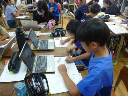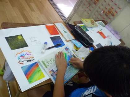 5年生は国語の学習で近畿地方について調べています。以前の紹介はグループでの話し合いの場面でしたが、今日は自分で調べて文章でまとめていました。「心の模様」の絵(自分の描いた模様を見てどんな気持ちになるか吹き出しに書きます)が完成しました。