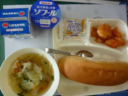6月10日の給食は「えびのチリソース」「中華スープ」でヨーグルトがつきました。中華味がとてもおいしかったです。
