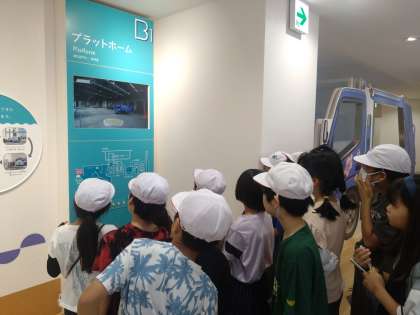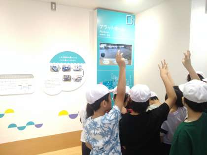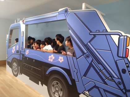 パッカー車の模型で記念撮影です。説明パネルのクイズに手を挙げています。