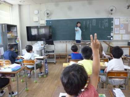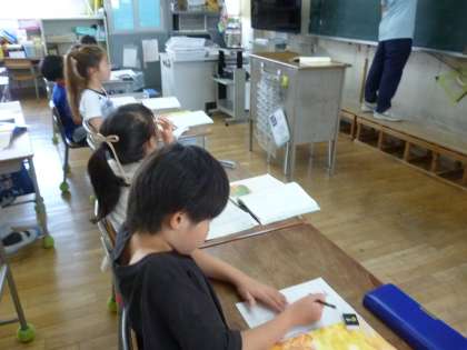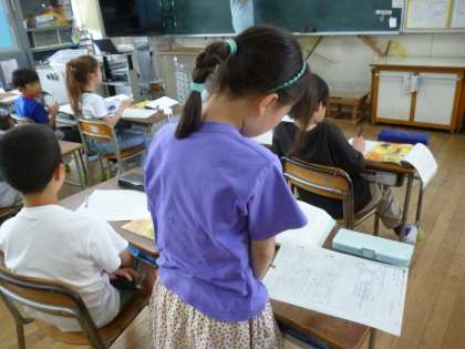 3年生は物語の読み取りをしています。登場人物の気持ちを考え、発表していきました。友達の意見に対して自分の考えを出し合って交流していきました。「チョキ」を出している子は友達の意見に「付け足す」という意味です。