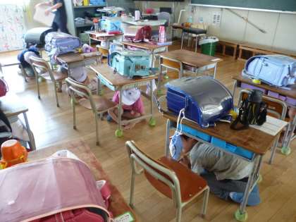 今日は避難訓練をしました。災害想定は「地震・津波」です。机の下にもぐり、その後に運動場に避難しました。そして津波を想定して最上階の4階に避難しました。みんな落ち着いて速やかに避難していきました。