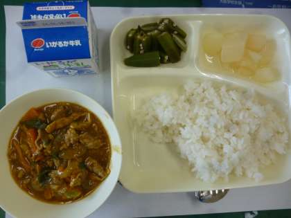 6月12日の給食は「和風カレー丼」「オクラのかつお梅風味」でデザートに缶詰の梨が出ました。カレーライスは大人気献立ですが、和風味もとてもよい味でした。