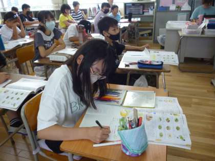 6年生は家庭科の学習で朝食を考えました。栄養や自分の好みを考えた朝食献立です。楽しくおいしそうな朝食を発表していきました。その後、エプロン作りを始めました。待ち針で止めるなどコツコツと仕上げていきました。