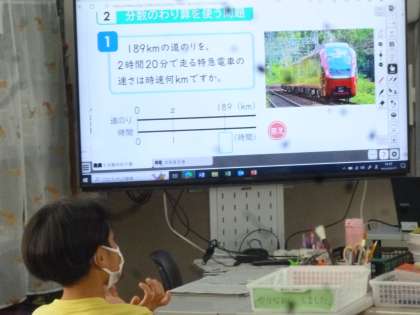 6年生は写真のように分数のわり算をしました。写真の問題です。2時間20分を分数になおして計算するのでむずかしい問題です。ノートに線分図を書いて考えていきました。