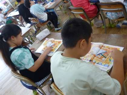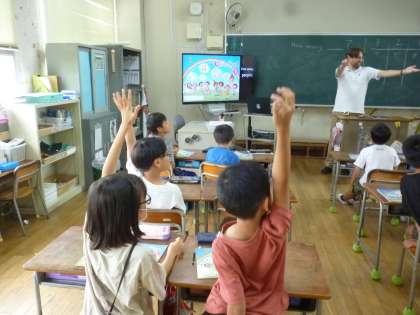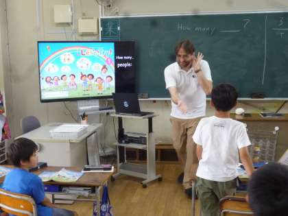 3年生は教科書の挿絵を見て、先生が英語で「赤鉛筆の数は?」などの問題で数を数えて英語で答えていきました。挿絵を見て指で指しながら数えていました。20を超える数字もあり、しっかりと英語で答えていました。