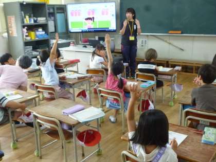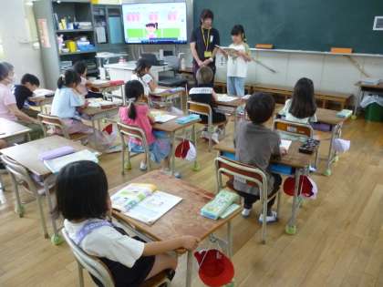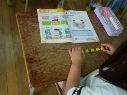 1年生は引き算を使うお話を考えて発表していきました。たくさんのお話が出て先生は大いに褒めていました。タイルを使って引き算のしかたを確認もしました。