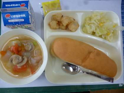 6月17日の給食は「いか天ぷら」「フレッシュトマトのスープ煮」「キャベツとコーンのサラダ」」です。いか天ぷらはサクッと揚げており、とてもおいしく子どもたちに大人気でした。