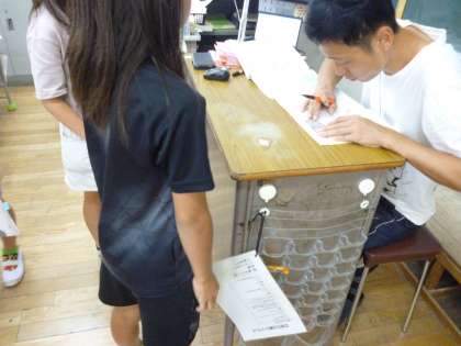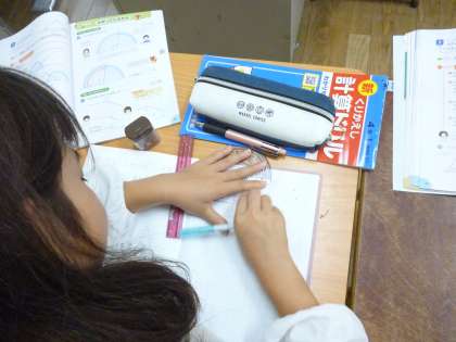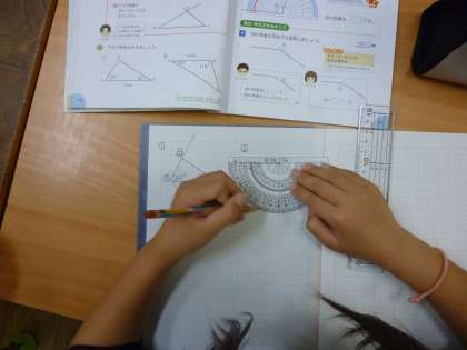 4年生は分度器を使って三角形を書きました。角度を正確に測りていねいに書いていきました。書いた三角形は担任の先生に見てもらいました。