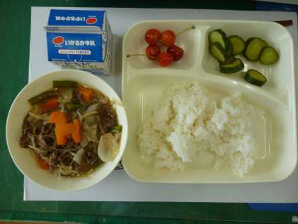 6月19日の給食は「牛肉と野菜の炒め煮」「きゅうりのしょうがづけ」でデザートにサクランボが出ました。今日の給食に関連して月曜日の児童朝会で「学校の桜には種類が違うからサクランボはできない。サクランボは寒い地方で採れる。山形県が一番多い」というサクランボの話をしました。