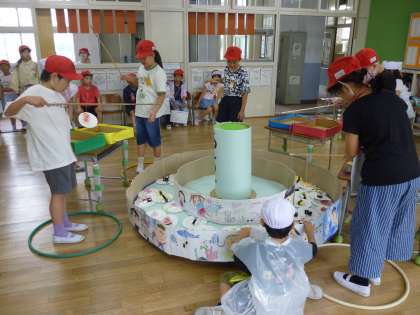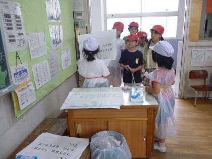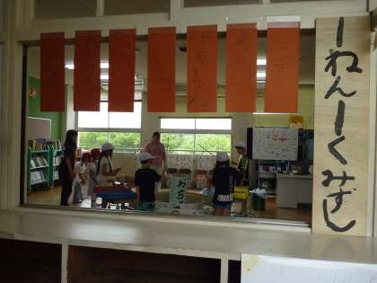 1年生は「1ねん1くみずし(寿司)」です。回転ずしの模型の中の紙で作ったお寿司を磁石で釣り上げます。