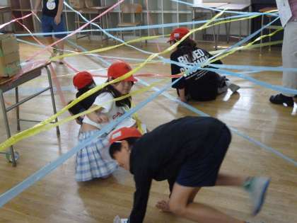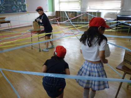 スパイゲームは教室に張り巡らせたスズランテープの下をくぐります。大人にはきついげーむです。