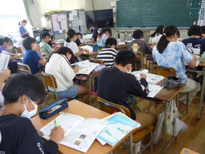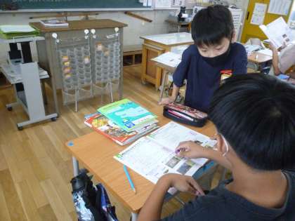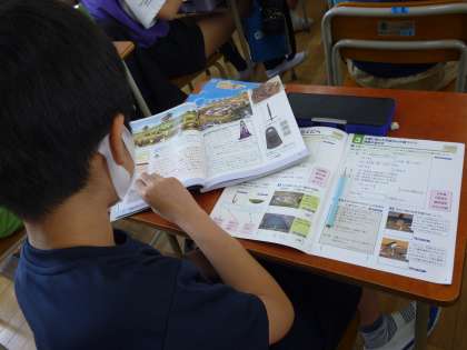 6年生は社会科で歴史を学習しています。今日は縄文時代から古墳時代までをプリントで復習していきました。わからないところは優しく友だちに教えていました。
