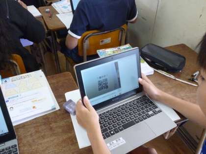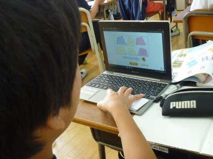 5年生は今日から「合同な図形」の学習を始めました。合同の意味を理解するため端末で図形を操作していきました。写真のようにQRコードを読み込み、画面上で図形を動かして合同を確かめていきました。