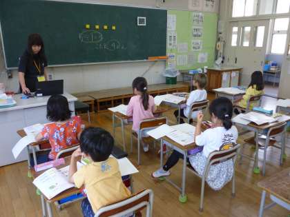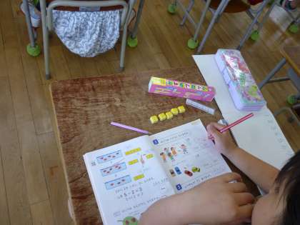 1年生は初めて引き算を習いました。引き算になるお話をブロックを使って考えていきました。教科書に答えを書き、正解なら初めて自分で赤丸をつけました。