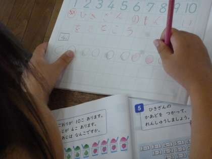 今日は「10−4」のひき算を学習しました。10から引く計算は初めてです。ノートに〇を10個書き、色鉛筆で4つ色を塗って目で確認していきました。