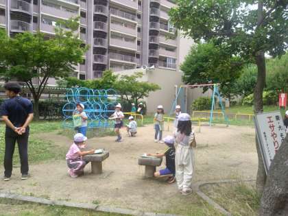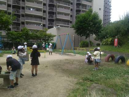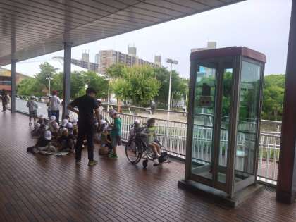 ポートタウン東駅で駅周辺の様子を見学してメモします。みんなしっかりと周りの様子を見ています。電話ボックスの説明もしました。