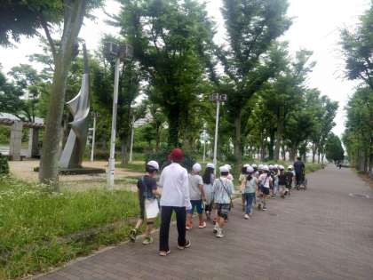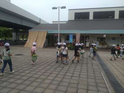 ポートタウン東駅からポートタウン西駅まで歩きます。南港は自然いっぱいですばらしい町です。西駅で駅周辺を見てメモをして見学を終えました。みんなしっかりと学習して充実した校区巡りになりました。