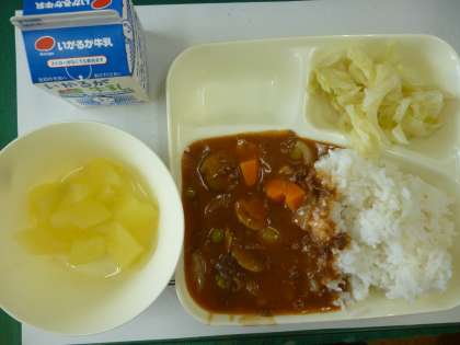 6月25日の給食は「ハヤシライス」「キャベツのゆずドレッシング」で缶詰のりんごが出ました。ハヤシライスはカレーライスと並ぶ人気献立です。