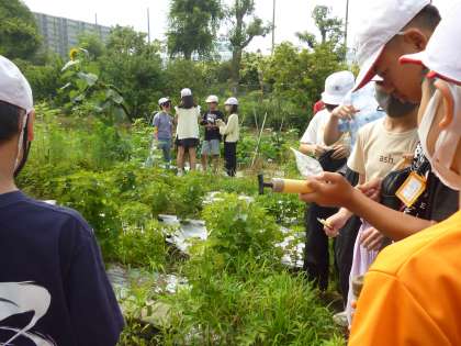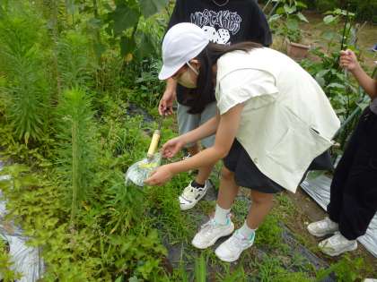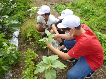 6年生は理科で植物の光合成について調べました。シソの葉にビニル袋をかぶせ、気体検知管で袋内の酸素と二酸化炭素の量を確認します。そのままにして焼く時間後に気体の量がどう変化した確かめました。光合成による気体の量の変化を記録していきました。