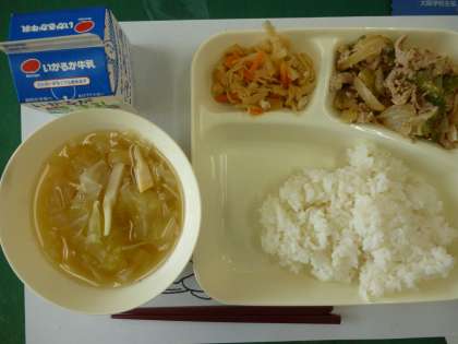 6月26日の給食は「豚肉のごまみそ焼き」「すまし汁」「切干大根の炒め煮」です。「豚肉のごまみそ焼きは、みそだれやごまが豚肉とよく合っており、とてもおいしく、子どもたちも喜んで食べていました。