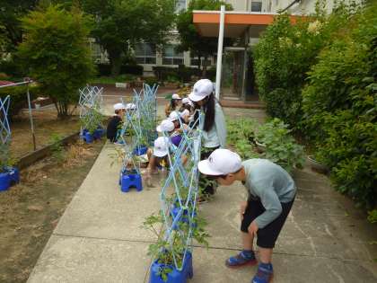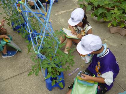 2年生はミニトマトの観察をしました。前回の観察の時はまだ実が実っていませんでしたが、今は緑色の実がなっていました。成長の様子を物差しで測っていきました。