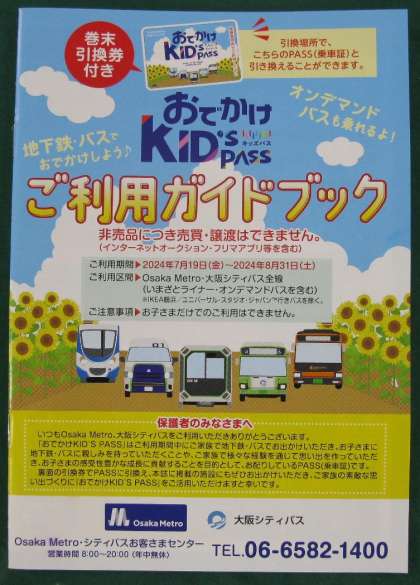 本日、地下鉄の無料乗車券の引き換え券がついている「おでかけKiDsPASS ご利用ガイドブック」持ち帰らせました。夏休みの間、7/12〜8/31まで無料の乗車券がもらえますので、よく読んで所定事項を記入の上、引き換え場所へお持ちください。