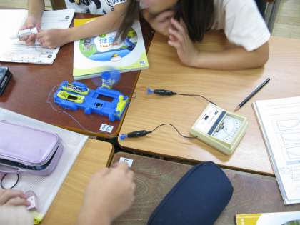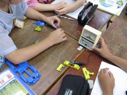 4年生は電流計を使って、電池の直列と並列の違いを調べました。回路をしっかりと確かめ、電流計の針の動きに集中していました。けっかがよくわかる楽しい学習です。