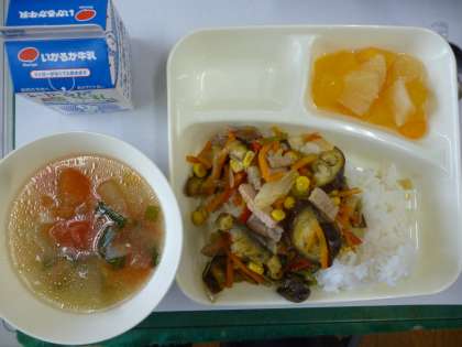 7月2日の給食は「夏野菜飯」「パワースープ」「トロピカルゼリー」です。今日の給食は「学校給食献立コンクール」優秀賞の献立です。平野西小学校の子どもたちが考えました。その子どもたちのメッセージです。「夏祭りのだんじりを盛り上げるために、給食で夏野菜をたくさん食べて体力をつけることができるように工夫しました。お祭り気分を味わえるように彩をかんがえました」杭全神社のだんじりが有名な平野区らしいメッセージです。