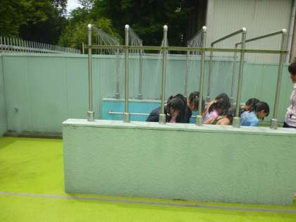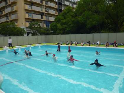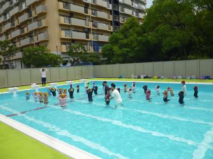 今日は1年生と2年生が今年初めてプールに入りました。1年生にとって小学校初めてのプール水泳です。シャワーを浴びゆっくりプールに入りました。顔をつけたり、ジャンプしながら歩いたりと水遊びを楽しんでいました。