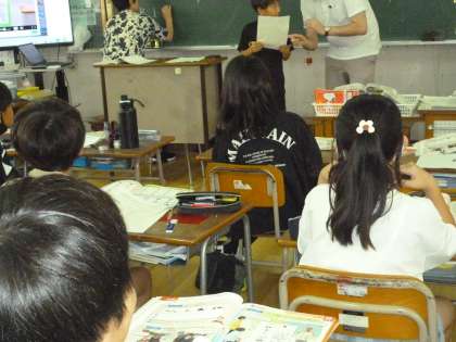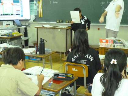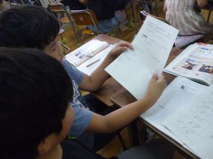 5年生は英語の学習で自由に好きな時間割を決め、英語で教科を書く学習をしました。なかには「sleep]などユーモアいっぱいの時間割もあり、見せ合ったり発表し合って笑い声がいっぱいの学習でした。