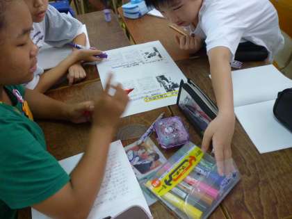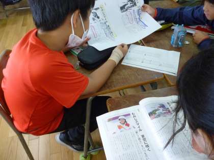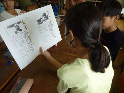 5年生は国語の学習で2つの新聞記事の違いについてグループで考えました。記事に大切なところにペンで色分けをして努力の跡がよくわかりました。