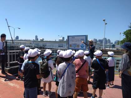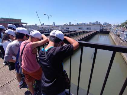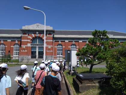 レンガ造りの建物を見ながら見学が始まりました。沈殿池から見ていきます。進むにつれて池の水がきれいになるのがよくわかります。