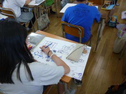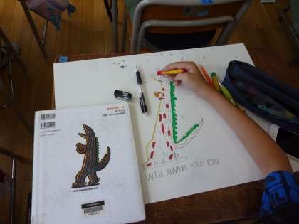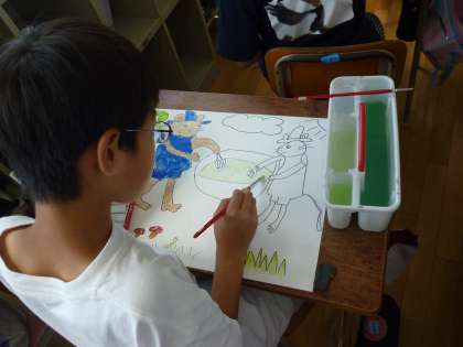 6年生は絵本を見てさし絵を描いていきました。線をペンで書き絵の具や色鉛筆でていねいに仕上げていきました。