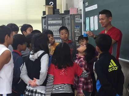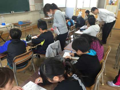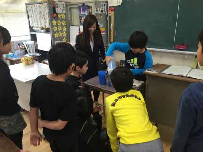4年生は少数のしくみを3つのグループに分かれて学習しています。少人数のよさを生かして、コップに色水を注いでみて、課題を見つけていました。