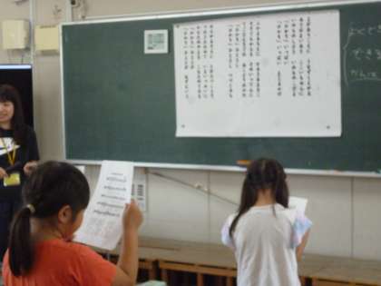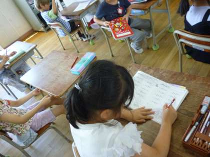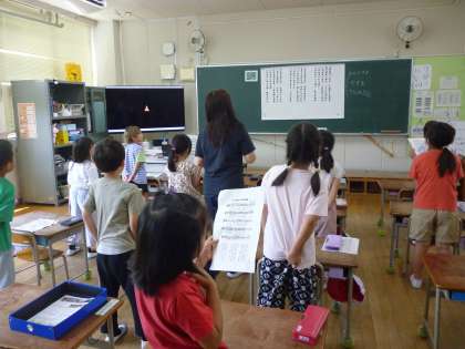 1年生はい学期のまとめをしています。計算や漢字の復習をして担任に見てもらっていました。今週の終業式に向けて校歌の練習もしていきました。元気いっぱいの1年生です。
