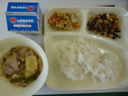 7月17日の給食は「豚肉とじゃがいもの煮物」「ひじき豆」「ささみと野菜のごまみそ焼き」です。今日は和食でどれもご飯によく合う味でした。